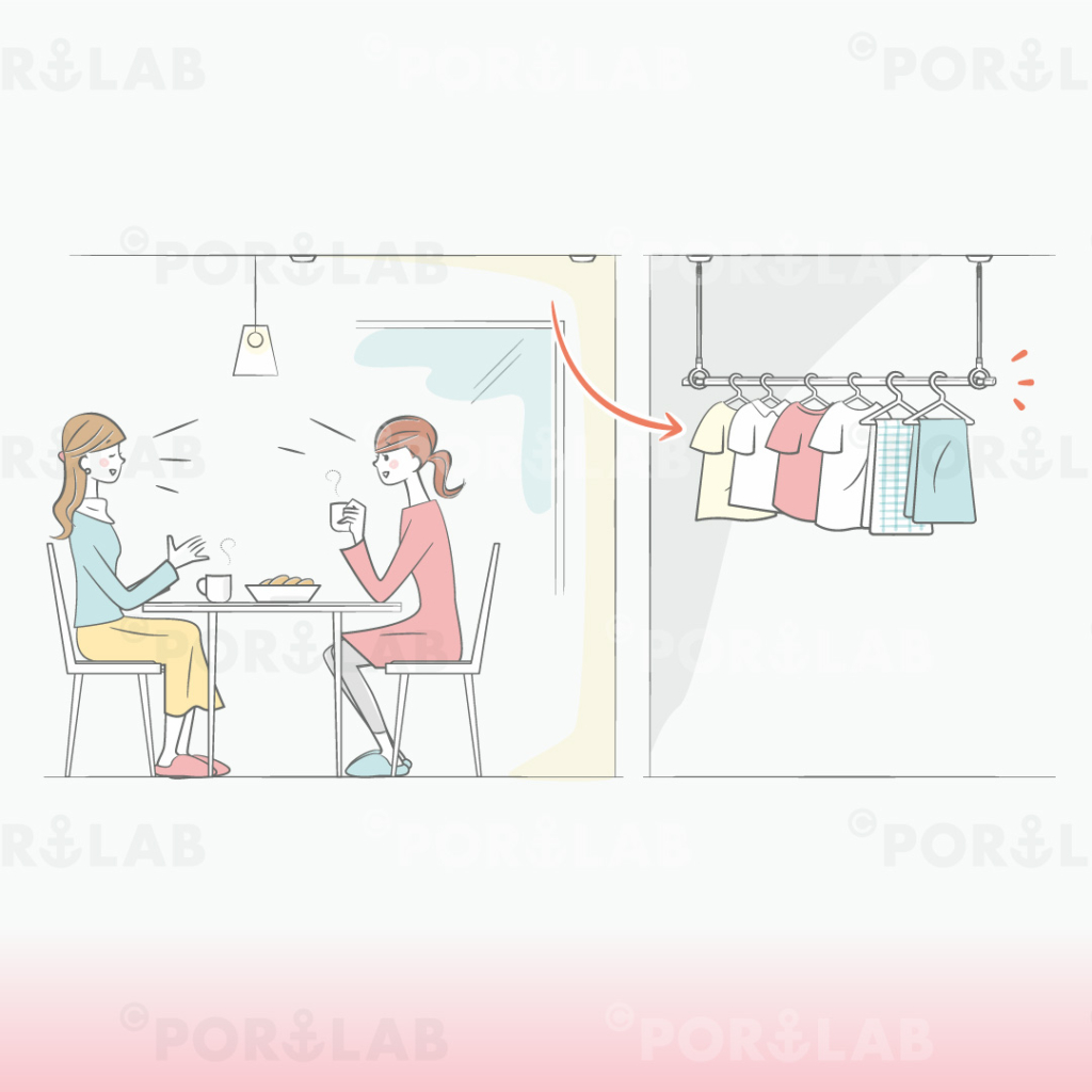 室内用物干し商品の説明用イラストとして、掃除機などの家事をしたり、室内でくつろぐ女性のイラストを制作しました。