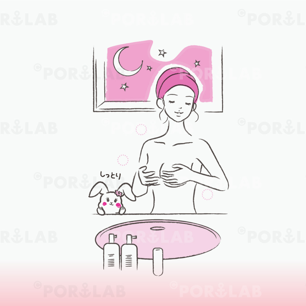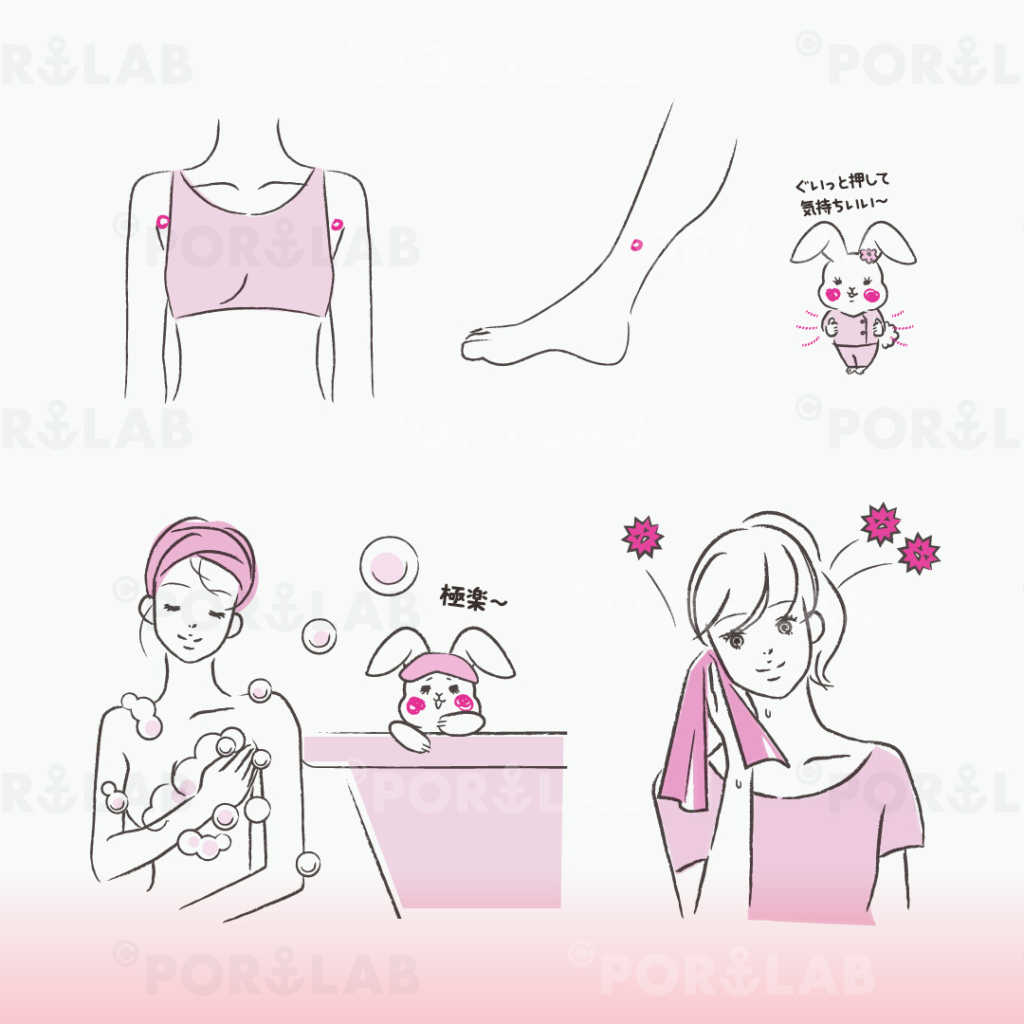女性の胸を美しく健康に保つノウハウが丁寧に書かれた書籍、「オトナ女子のためのおっぱいケア手帖」の挿絵として食事や入浴などのライフスタイル、うさぎのキャラクターなどのイラストを制作しました。(RENI_Bによる2色のタッチ)