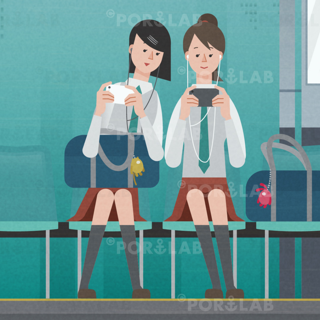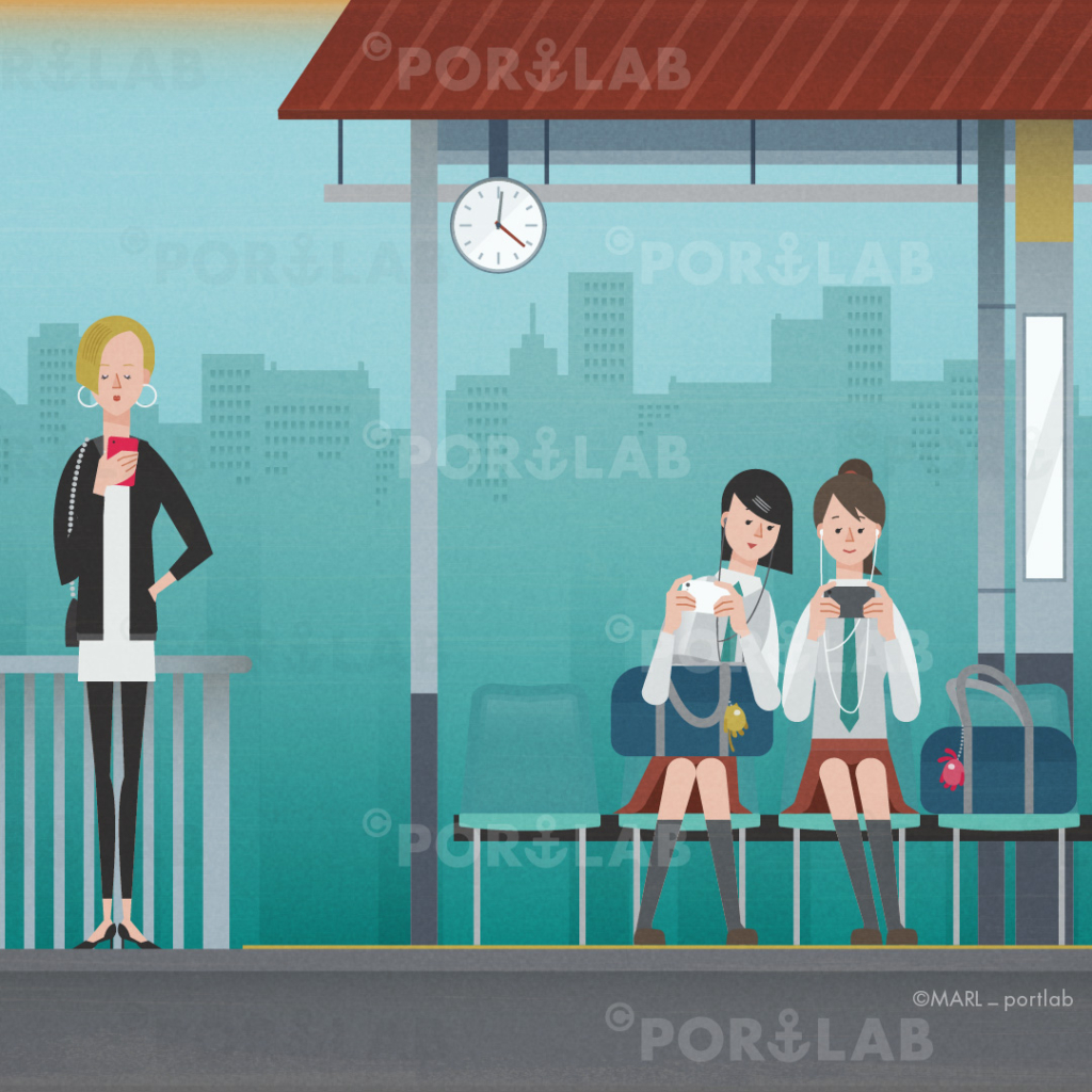 プラットホームでスマホを見る女子高生や電車を待つ人々のイラストを制作しました。下記リンク先のストック素材販売サイト、アマナイメージズからイラストが購入できます。