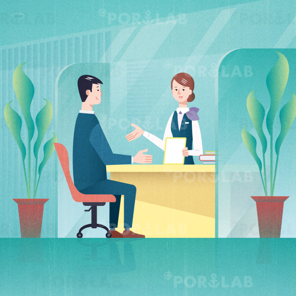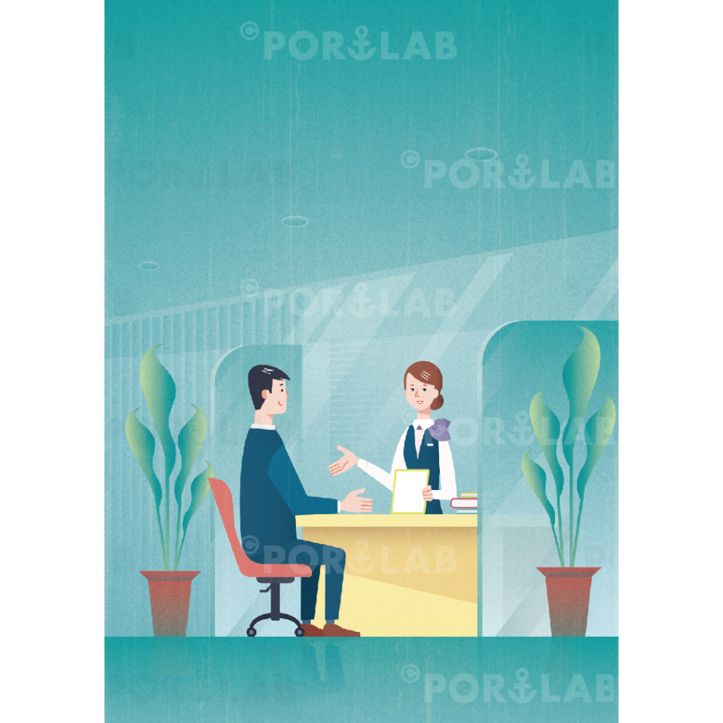 銀行業務の専門誌「バンクビジネス」2019年6月増刊号の表紙用に、提案をする女性銀行員と話を聞くスーツの男性会社員のイラストを制作しました。