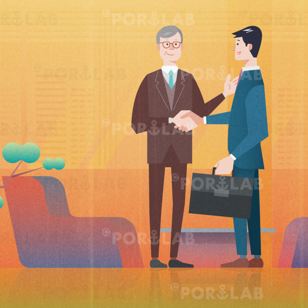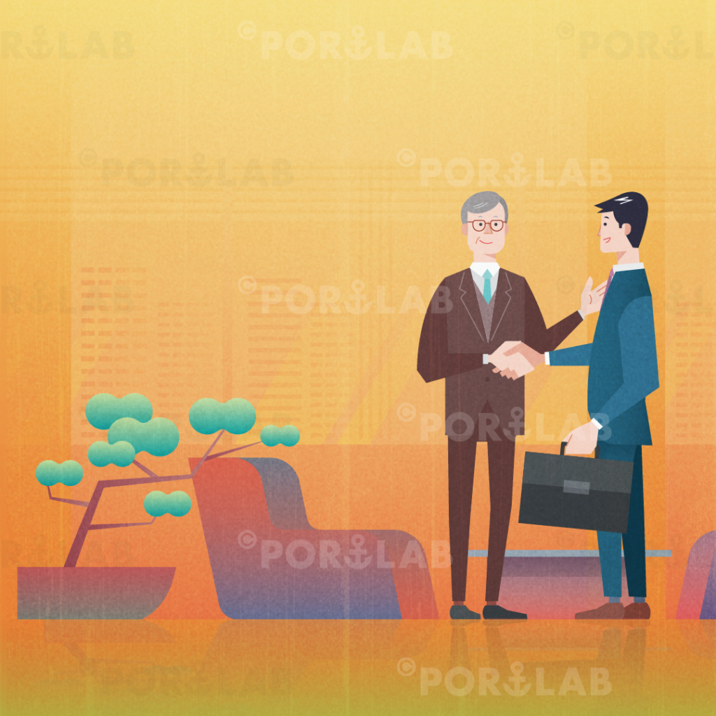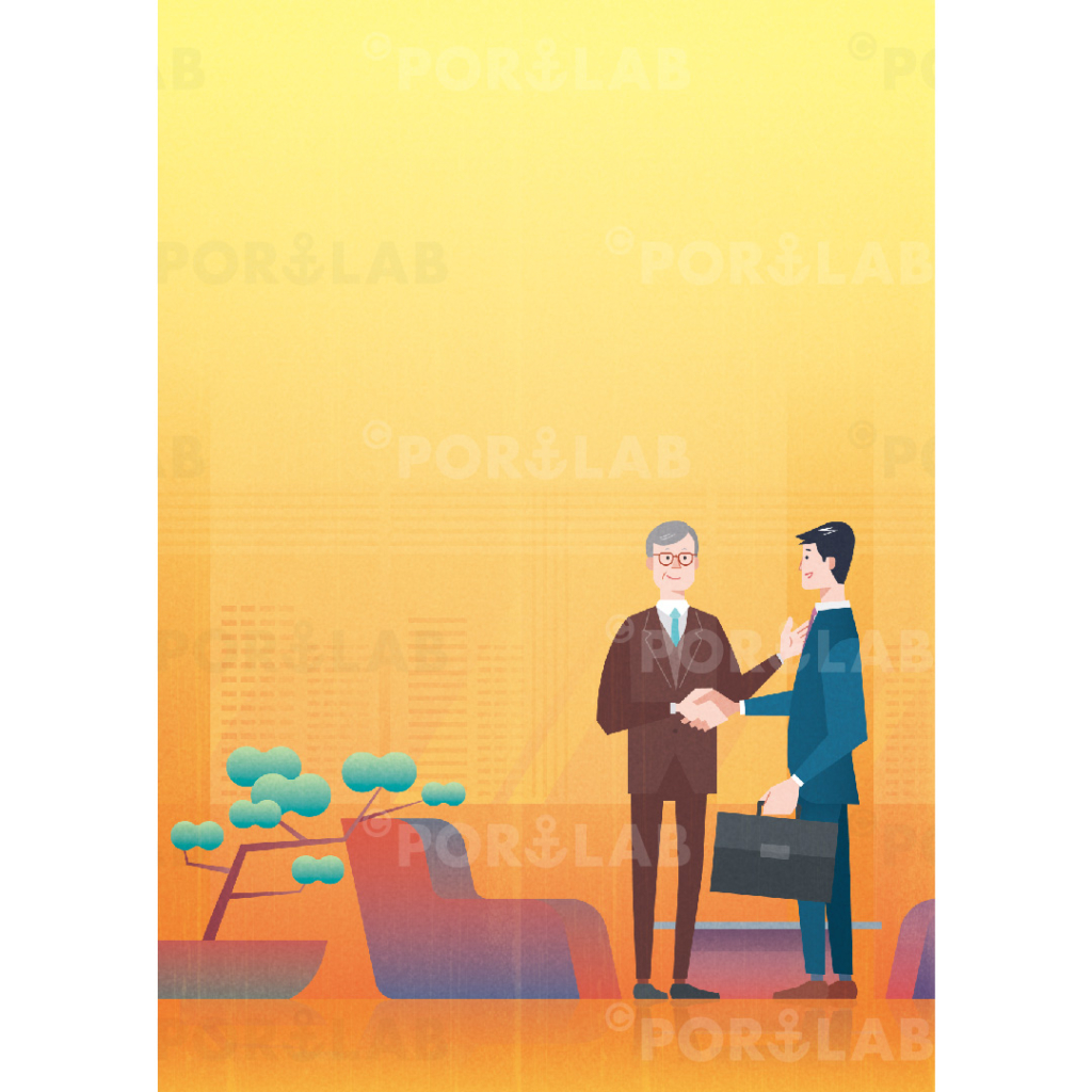 銀行業務の専門誌「バンクビジネス」2019年12月増刊号の表紙用に、応接室でクライアントと握手する会社員のイラストを制作しました。