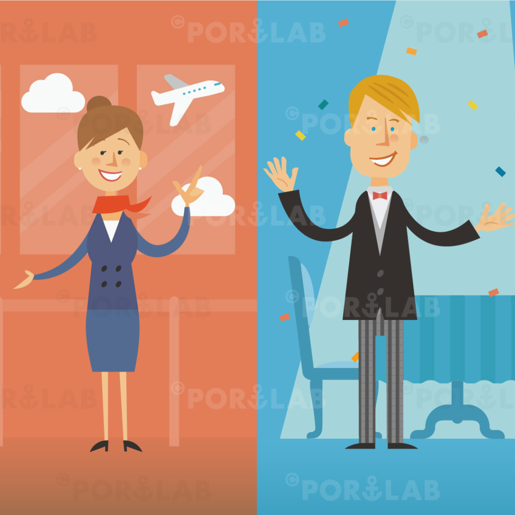 空港とCA、レストランと給仕、博士、ビジネスマンのイラストを制作しました。