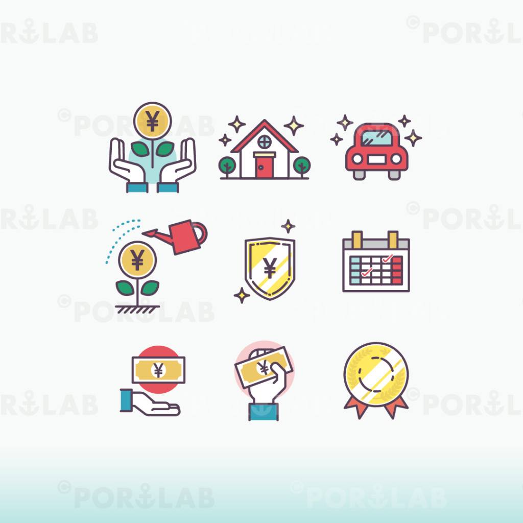 証券会社販促ツールの挿絵として、お金や住宅、車などライフスタイルに関するアイコンを制作しました。