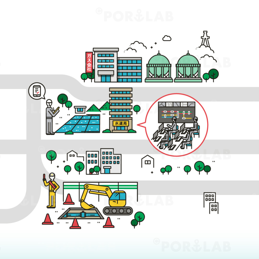 東京ガスエンジニアリングソリューションズ株式会社様の防災パンフレット「防災TUMSY」の街のイラストを制作しました。